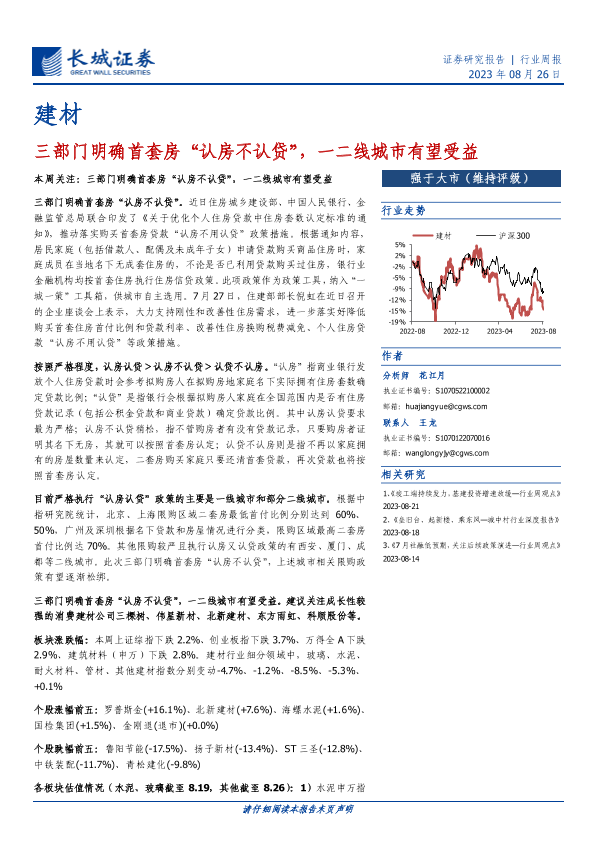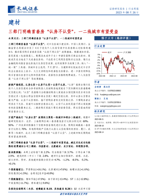 【长城证券】【20230826】建材行业周报:三部门明确首套房“认房不认贷”,一二线城市有望受益-18页