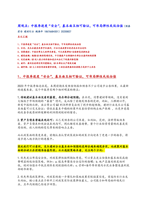 【国泰君安证券】【20230827】建材行业周观点:中报季进度“安全”,基本面互相可验证,可布局弹性或低估值-16页