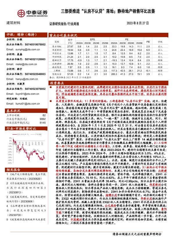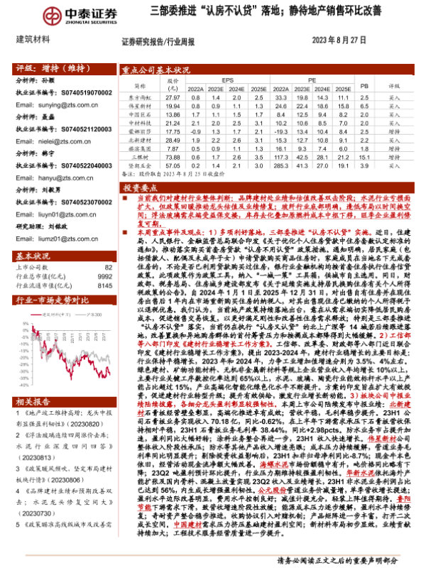 【中泰证券】【20230827】建筑材料行业周报:三部委推进“认房不认贷”落地;静待地产销售环比改善-25页