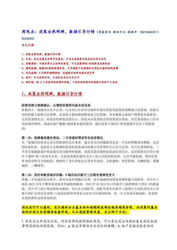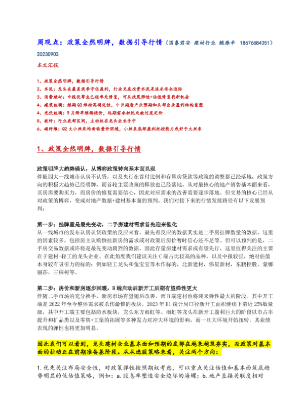 【国泰君安证券】【20230903】建材行业周观点:政策全然明牌,数据引导行情-17页