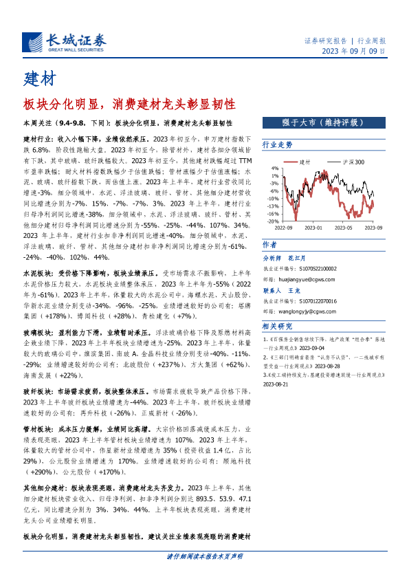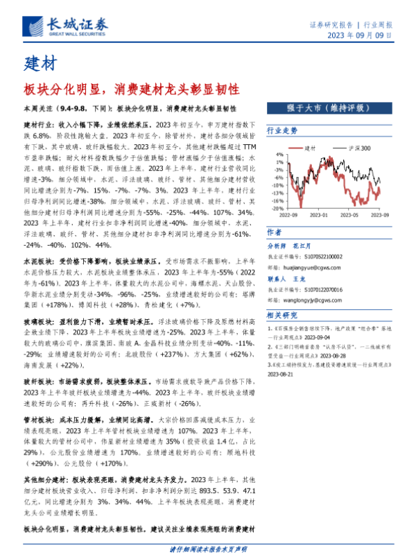 【长城证券】【20230909】建材行业周报:板块分化明显,消费建材龙头彰显韧性-25页