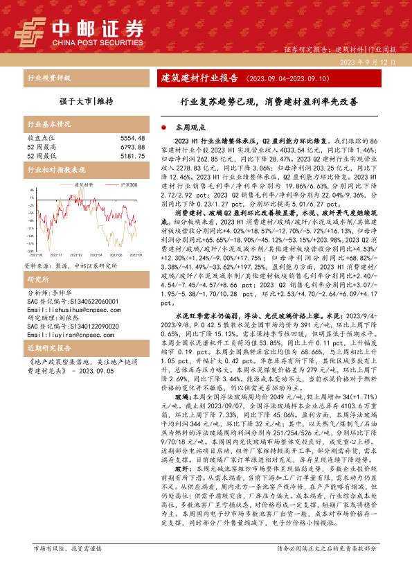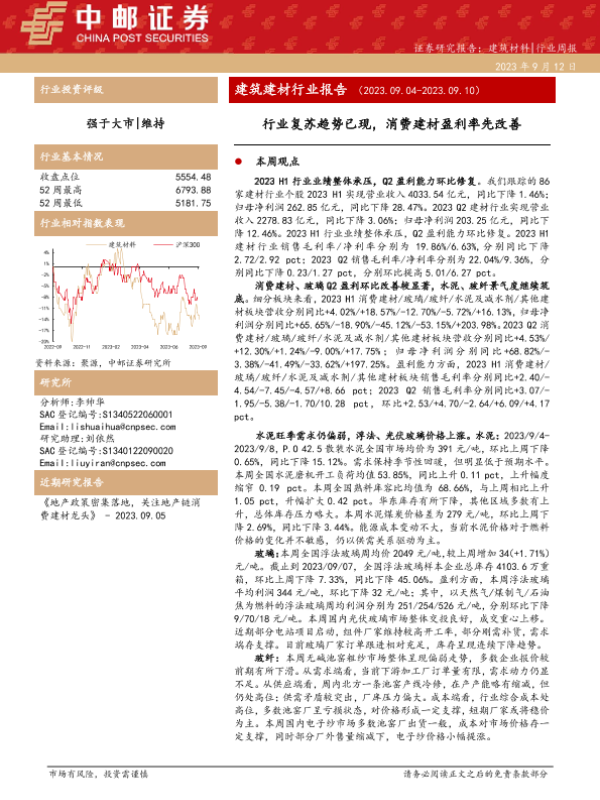 【中邮证券】【20230912】建筑建材行业报告:行业复苏趋势已现,消费建材盈利率先改善-24页