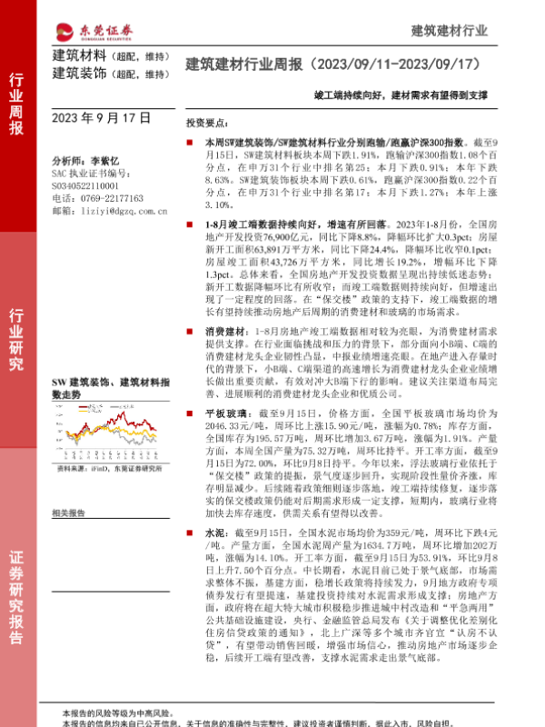 【东莞证券】【20230917】建筑建材行业周报:竣工端持续向好,建材需求有望得到支撑-15页