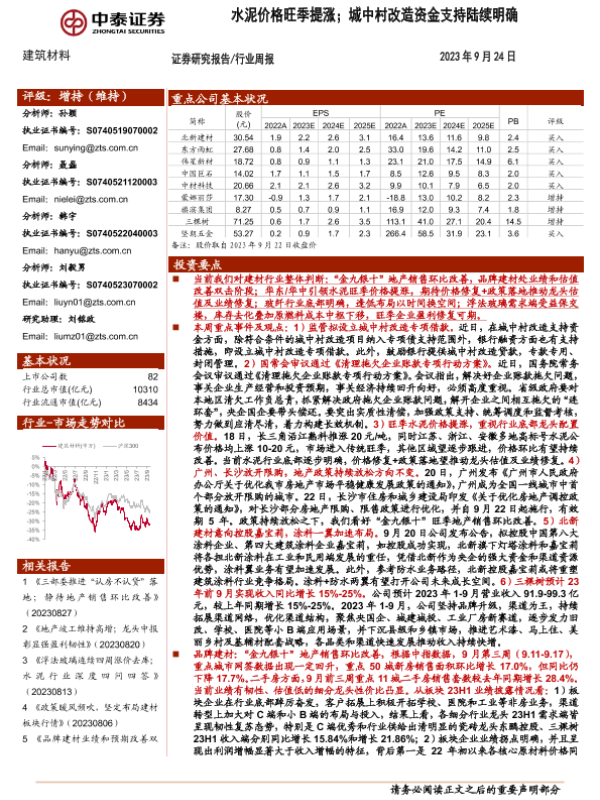 【中泰证券】【20230924】建筑材料行业周报:水泥价格旺季提涨;城中村改造资金支持陆续明确-25页