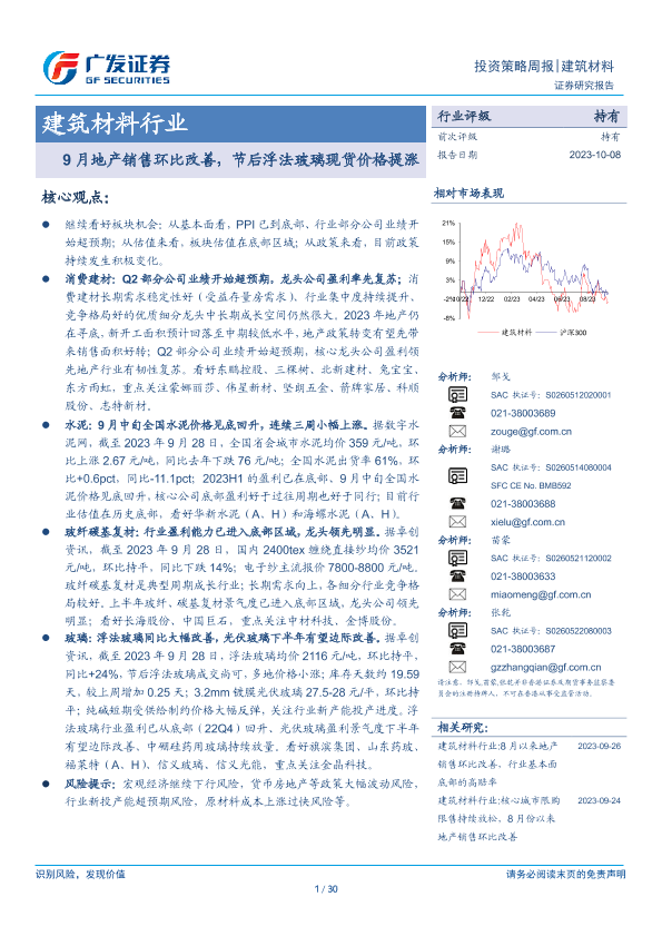 【广发证券】【20231008】9月地产销售环比改善,节后浮法玻璃现货价格提涨-30页