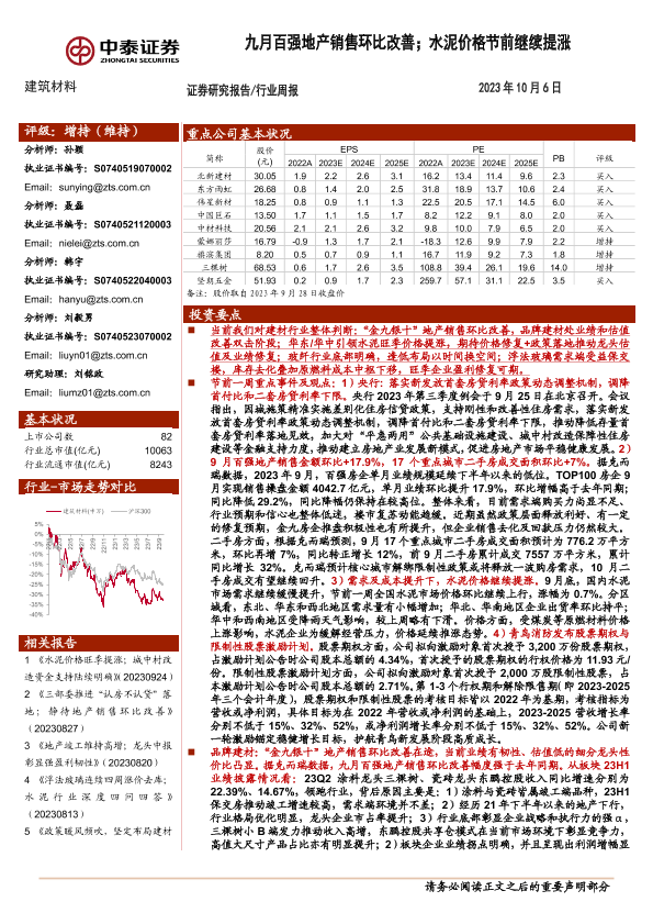 【中泰证券】【20231006】建筑材料行业周报:九月百强地产销售环比改善;水泥价格节前继续提涨-25页
