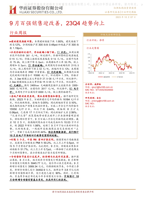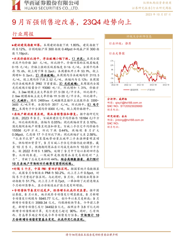 【华西证券】【20231007】建筑材料行业周报:9月百强销售迎改善,23Q4趋势向上-18页