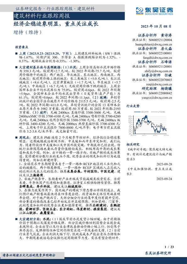 【东吴证券】【20231008】建筑材料行业跟踪周报:经济企稳迹象明显,重点关注成长-23页