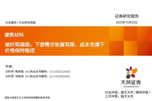 【天风证券】【20231022】玻纤周跟踪:下游需求恢复有限,成本支撑下价格保持稳定-19页