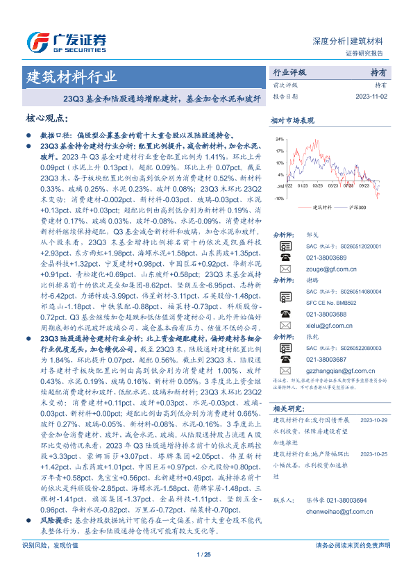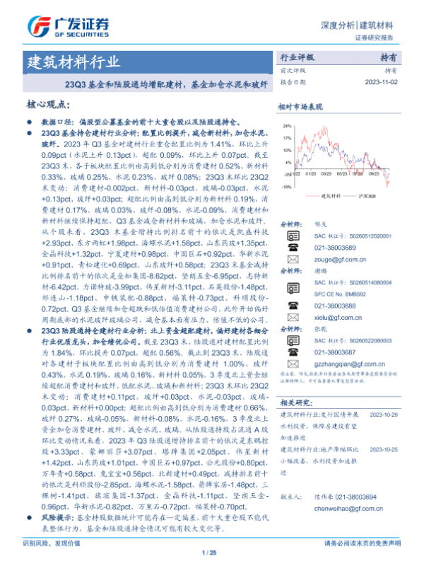 【广发证券】【20231102】23Q3基金和陆股通均增配建材,基金加仓水泥和玻纤-25页