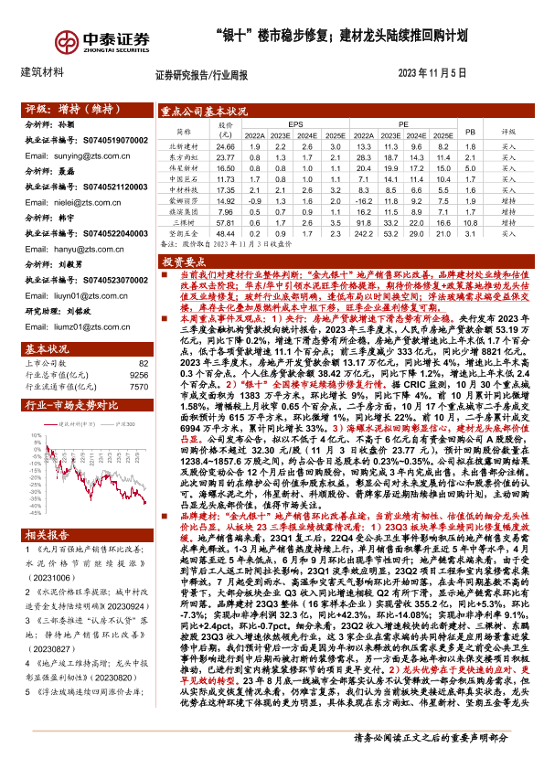 【中泰证券】【20231105】建筑材料行业周报:“银十”楼市稳步修复;建材龙头陆续推回购计划-24页