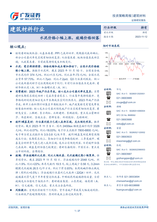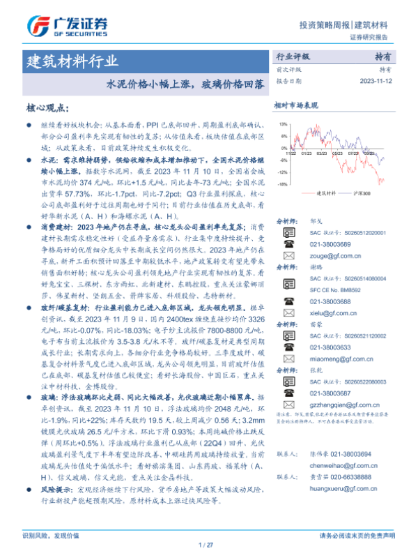【广发证券】【20231112】建筑材料行业投资策略周报:水泥价格小幅上涨,玻璃价格回落-27页
