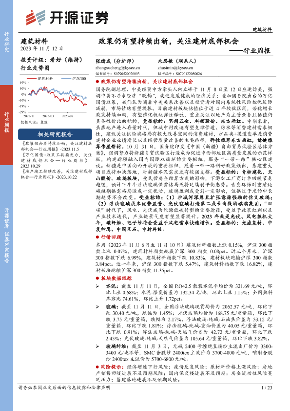 【开源证券】【20231112】建筑材料行业周报:政策仍有望持续出新,关注建材底部机会-23页