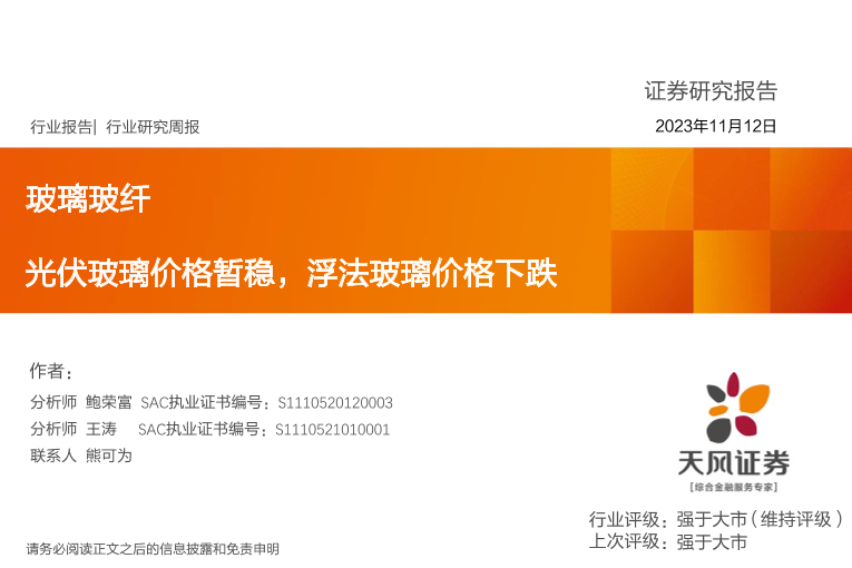 【天风证券】【20231112】玻璃玻纤行业研究周报:光伏玻璃价格暂稳,浮法玻璃价格下跌-18页