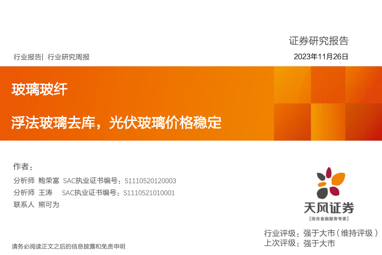 【天风证券】【20231126】玻璃玻纤行业研究周报:浮法玻璃去库,光伏玻璃价格稳定-18页
