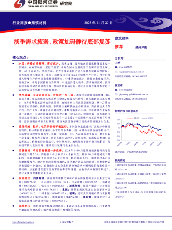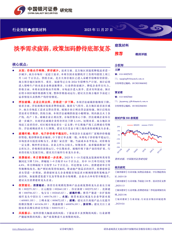 【银河证券】【20231127】建筑材料行业周报:淡季需求疲弱,政策加码静待底部复苏-12页