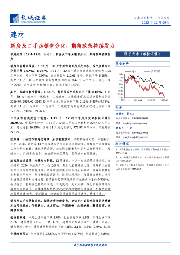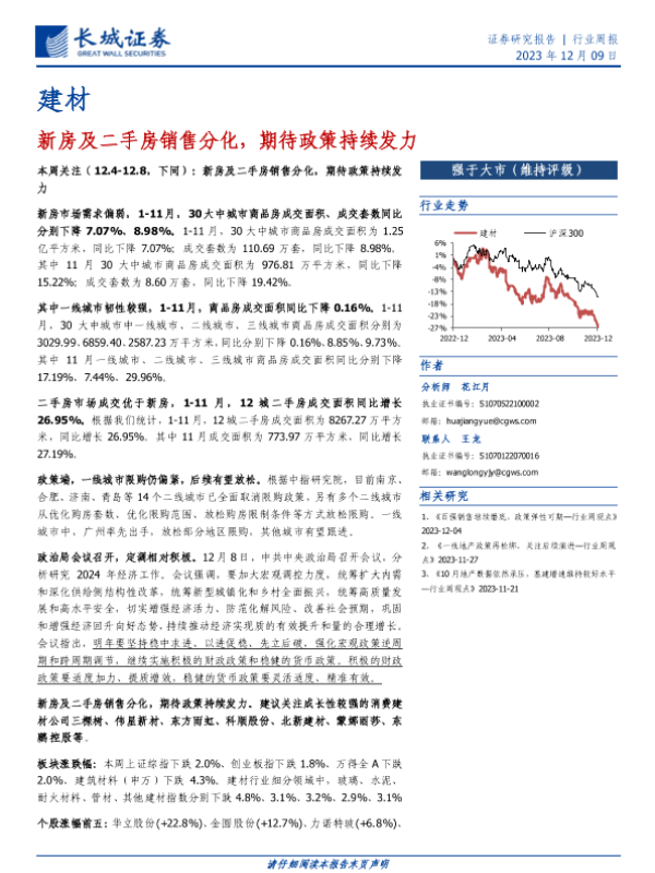 【长城证券】【20231209】建材行业周报:新房及二手房销售分化,期待政策持续发力-17页