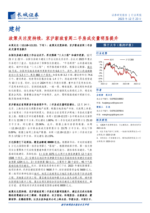 【长城证券】【20231223】建材行业周报:政策关注度持续,京沪新政首周二手房成交量明显提升-17页