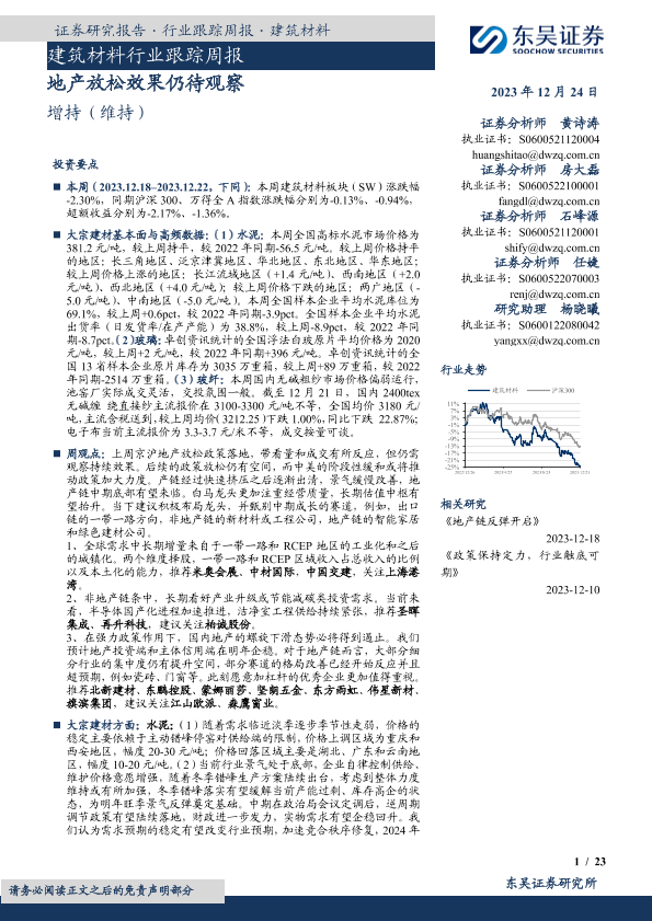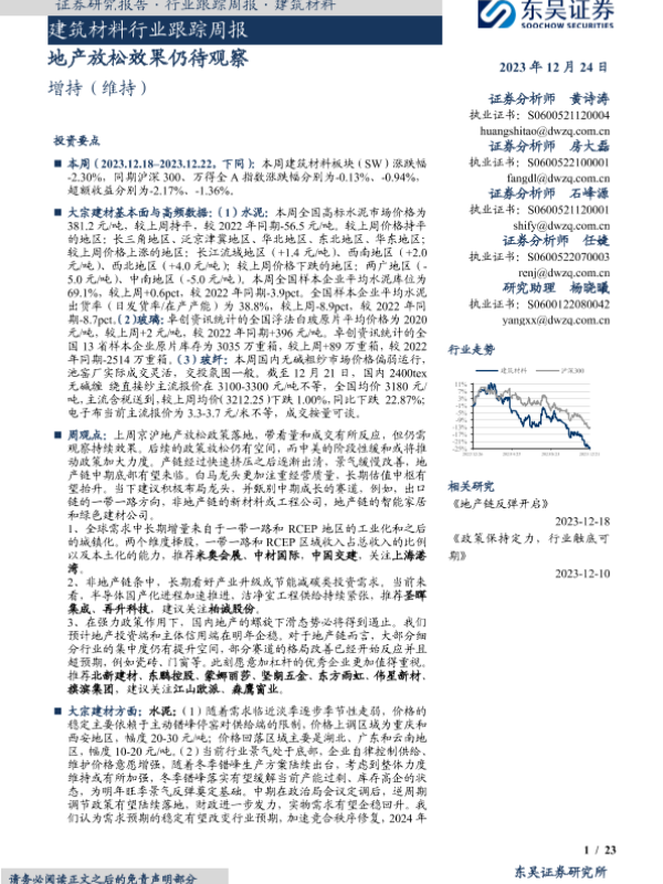 【东吴证券】【20231224】建筑材料行业跟踪周报:地产放松效果仍待观察-23页