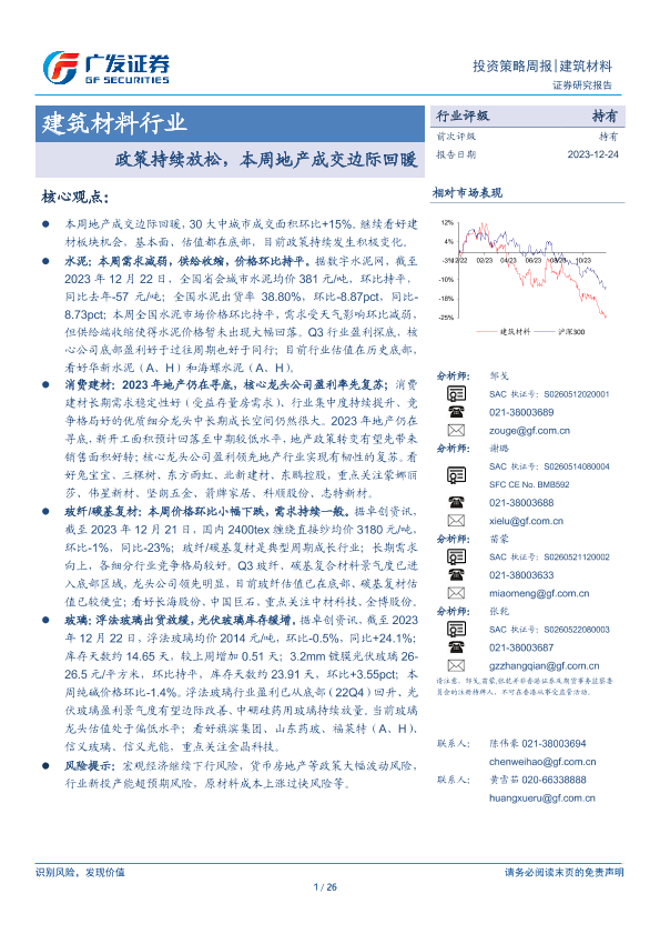 【广发证券】【20231224】建筑材料行业投资策略周报:政策持续放松,本周地产成交边际回暖-26页