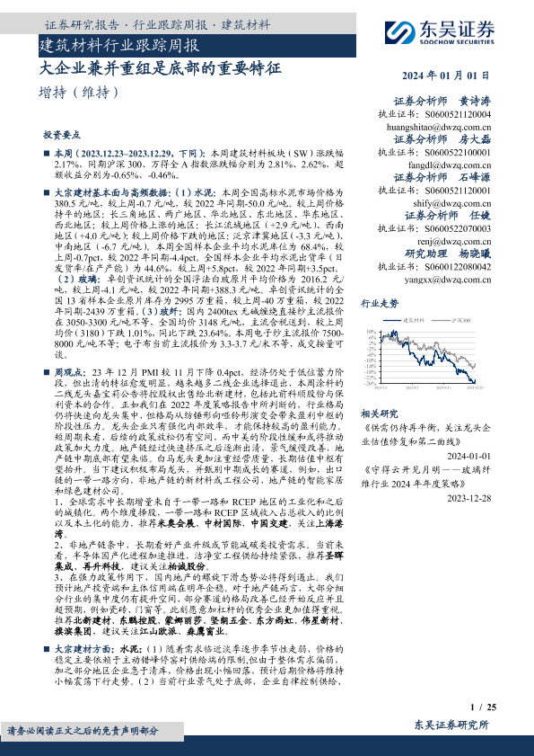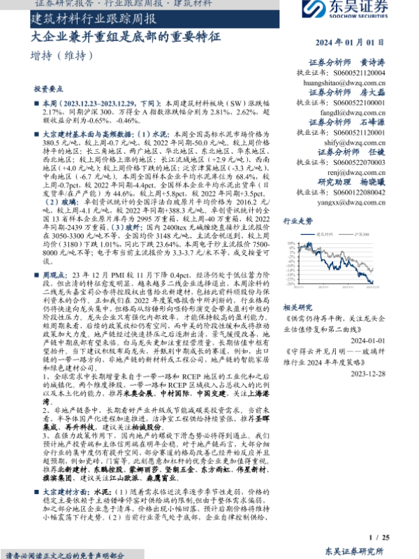 【东吴证券】【20240101】建筑材料行业跟踪周报:大企业兼并重组是底部的重要特征-25页