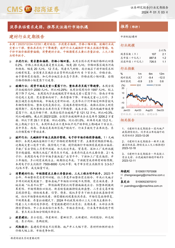 【海通证券】【20240103】建材行业定期报告:淡季来临需求走弱,推荐关注海外市场机遇-21页