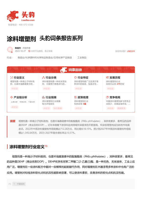 【头豹研究院】【20231027】涂料增塑剂 头豹词条报告系列-19页