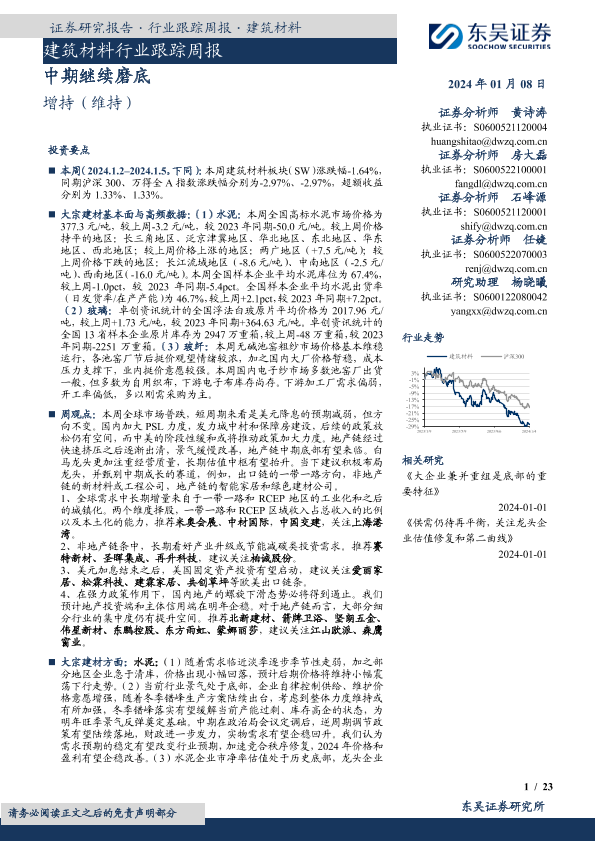 【东吴证券】【20240108】建筑材料行业跟踪周报:中期继续磨底-23页