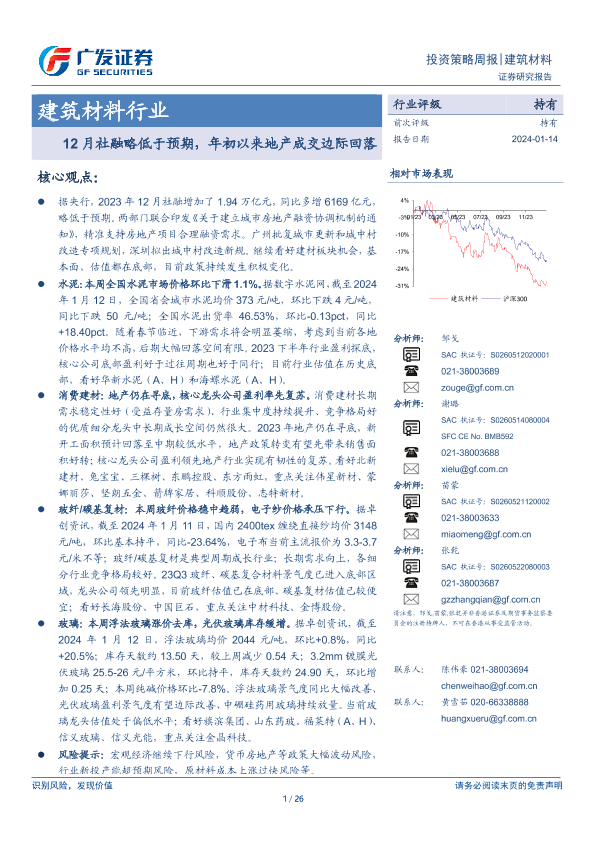 【广发证券】【20240114】建筑材料行业投资策略周报:12月社融略低于预期,年初以来地产成交边际回落-26页