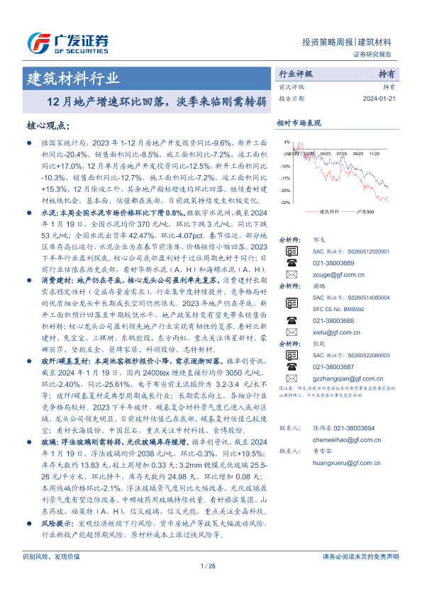 【广发证券】【20240121】建筑材料行业投资策略周报:12月地产增速环比回落,淡季来临刚需转弱-26页