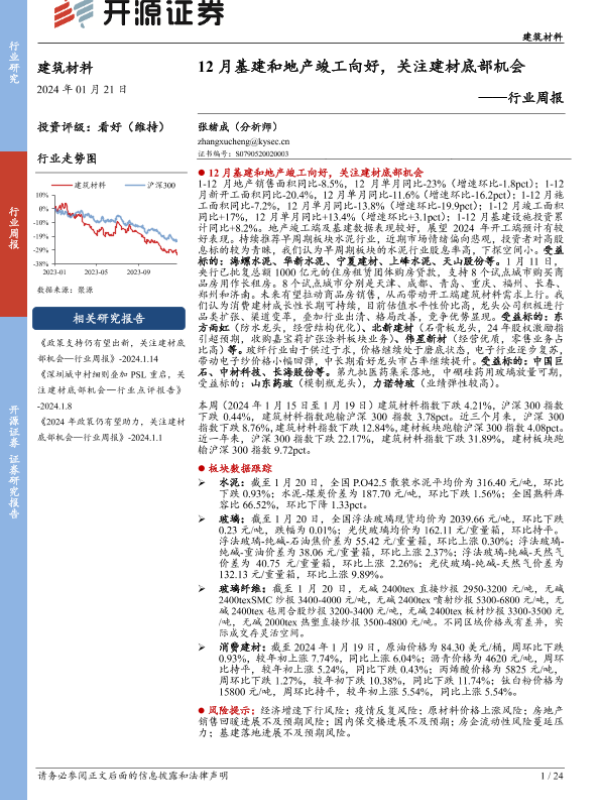 【开源证券】【20240121】建筑材料行业周报:12月基建和地产竣工向好,关注建材底部机会-24页