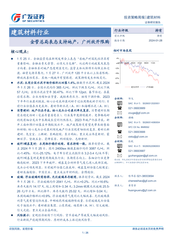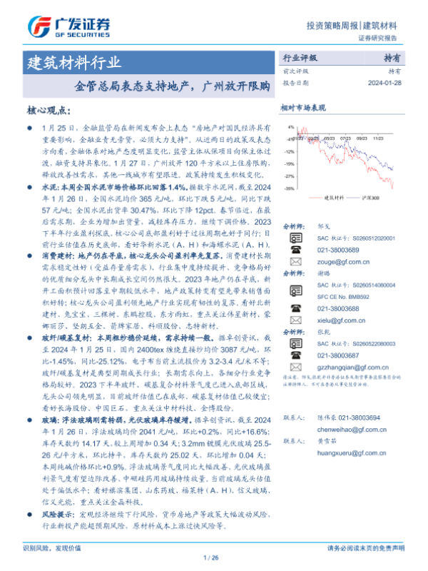 【广发证券】【20240128】建筑材料行业投资策略周报:金管总局表态支持地产,广州放开限购-26页