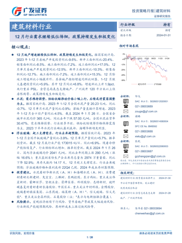 【广发证券】【20240131】建筑材料行业投资策略月报:12月行业需求继续低位徘徊,政策持续发生积极变化-26页