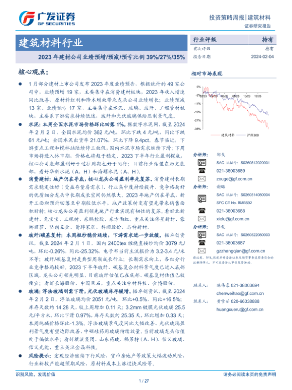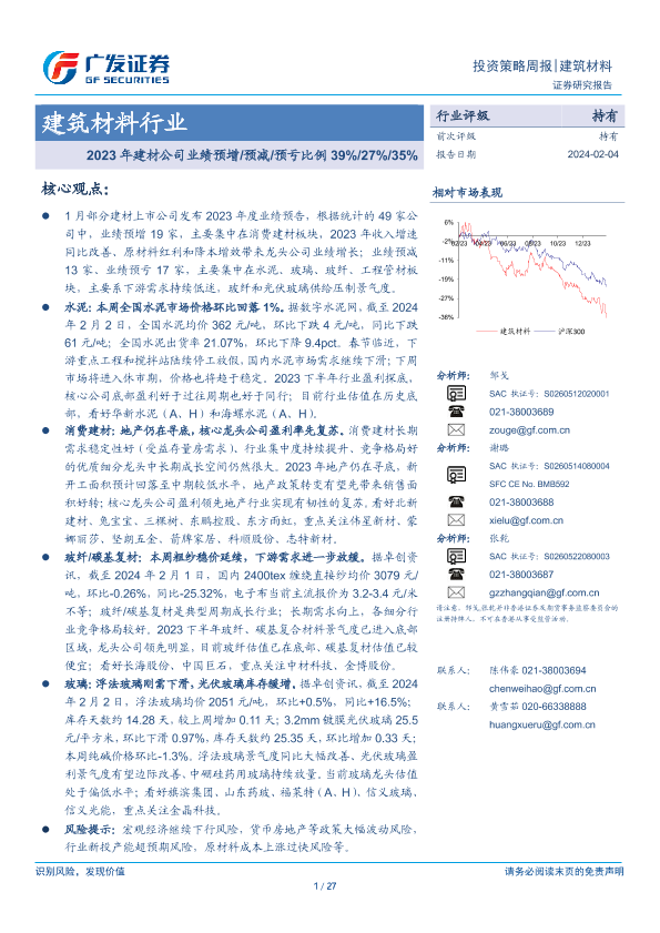 【广发证券】【20240204】建筑材料行业投资策略周报:2023年建材公司业绩预增预减预亏比例39% 27% 35%-27页