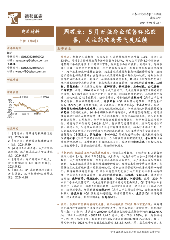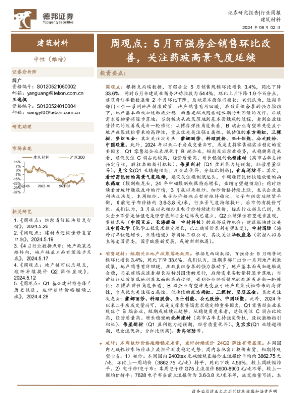 【德邦证券】【20240602】建筑材料行业周观点:5月百强房企销售环比改善,关注药玻高景气度延续-31页