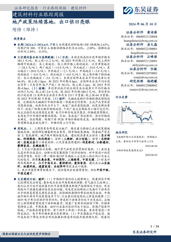 【东吴证券】【20240610】建筑材料行业跟踪周报:地产政策陆续落地,出口依旧亮眼-24页