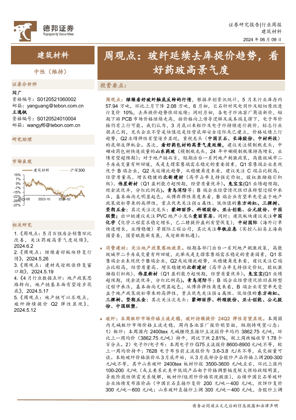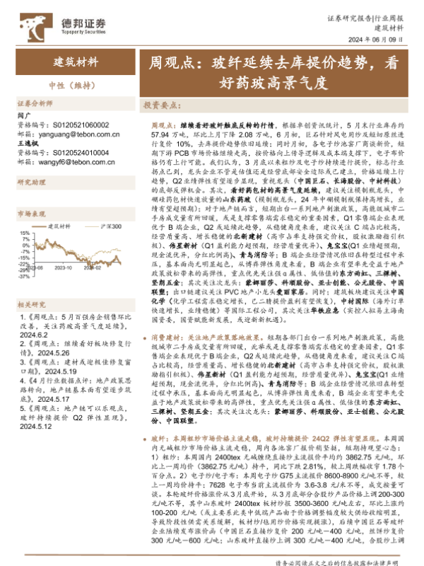 【德邦证券】【20240609】建筑材料行业周观点:玻纤延续去库提价趋势,看好药玻高景气度-32页