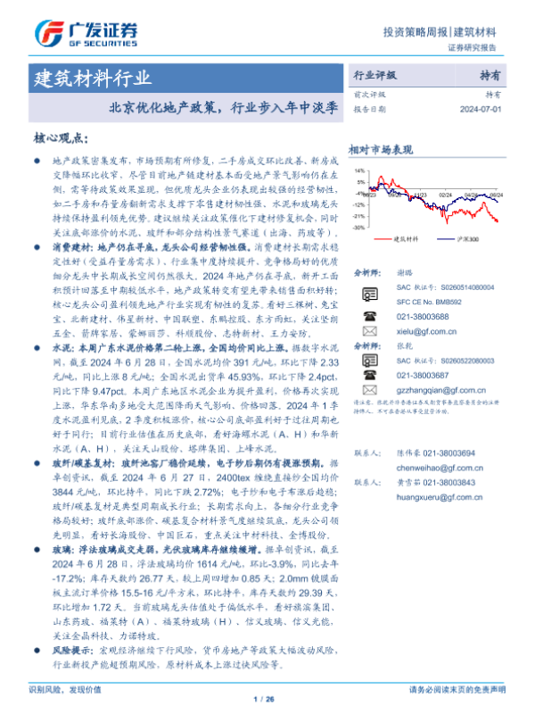 【广发证券】【20240701】建筑材料行业投资策略周报:北京优化地产政策,行业步入年中淡季-26页