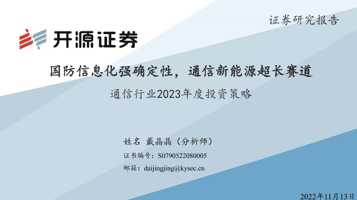 【开源证券】【20221113】通信行业2023年度投资策略:国防信息化强确定性,通信新能源超长赛道-23页