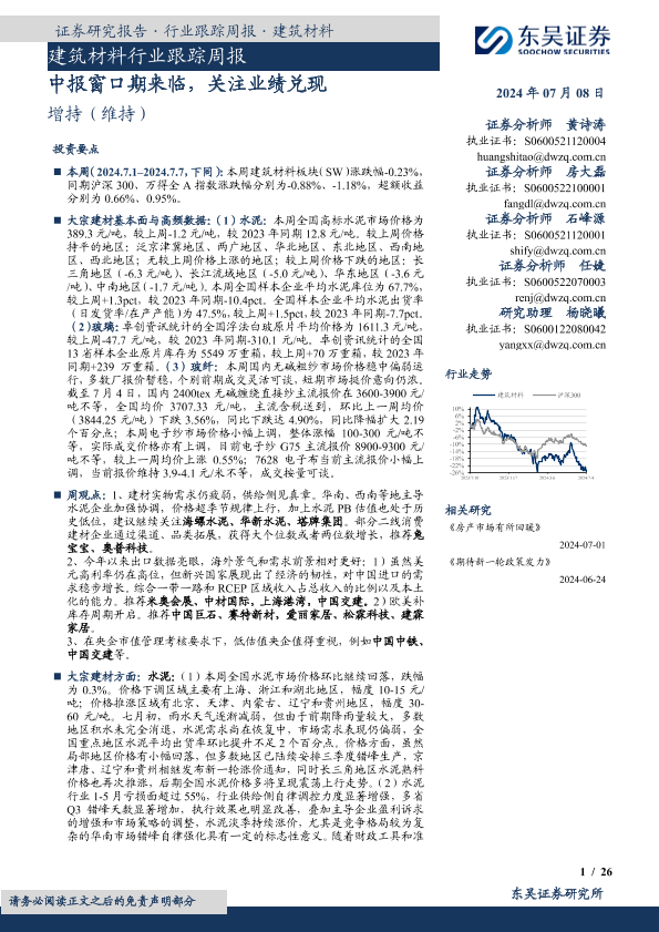 【东吴证券】【20240708】建筑材料行业跟踪周报:中报窗口期来临,关注业绩兑现-26页