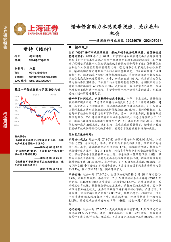 【上海证券】【20240708】建筑材料行业周报:错峰停窑助力水泥淡季提涨,关注底部机会-11页