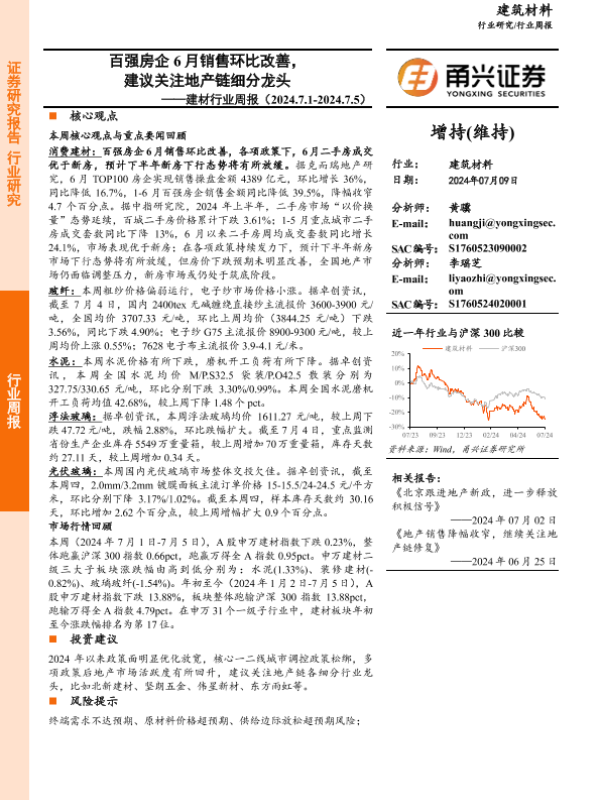 【甬兴证券】【20240709】百强房企6月销售环比改善,建议关注地产链细分龙头-15页