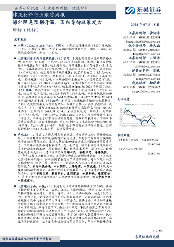 【东吴证券】【20240715】建筑材料行业跟踪周报:海外降息预期升温,国内等待政策发力-25页