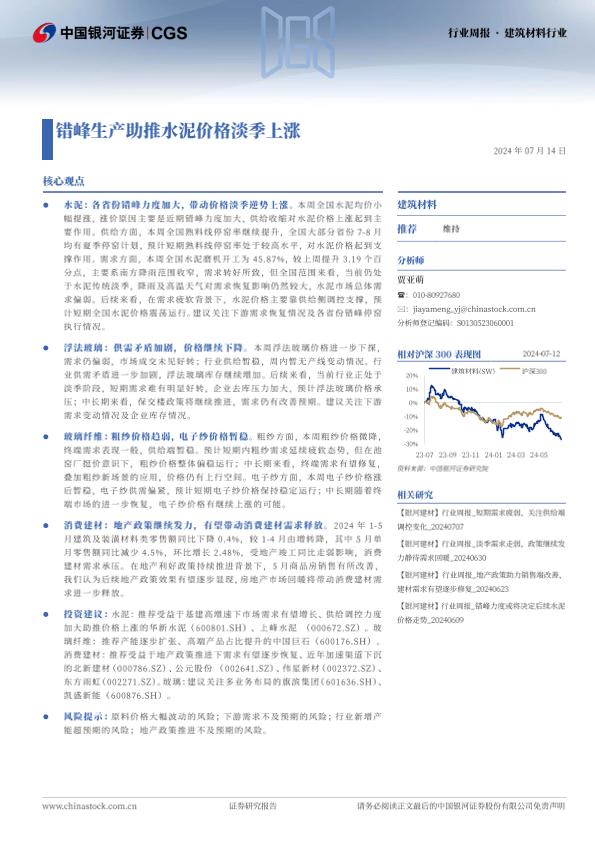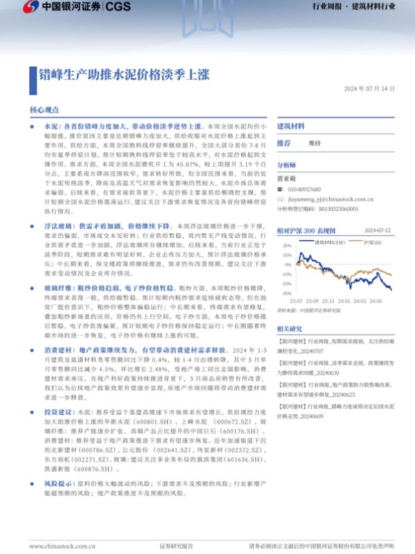 【银河证券】【20240714】建筑材料行业周报:错峰生产助推水泥价格淡季上涨-12页