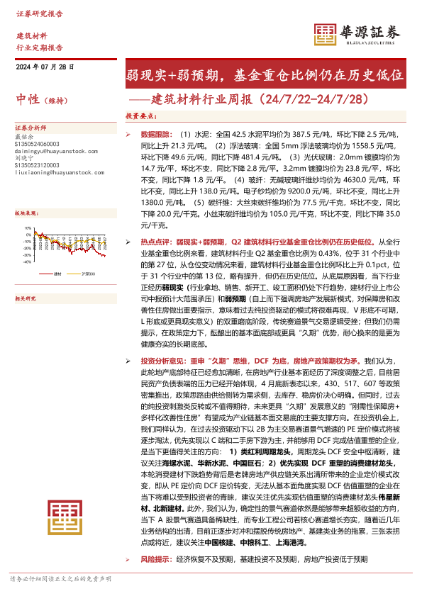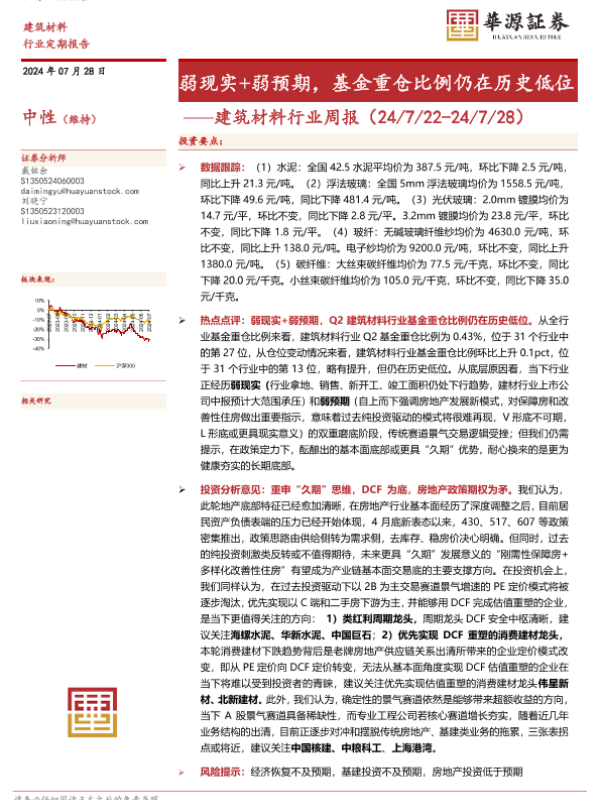 【华源证券】【20240728】建筑材料行业周报:弱现实+弱预期,基金重仓比例仍在历史低位-16页