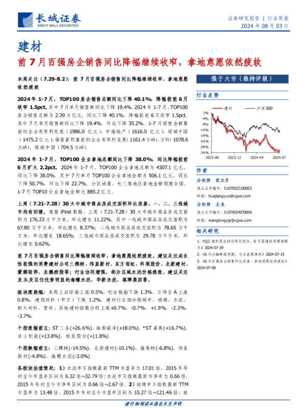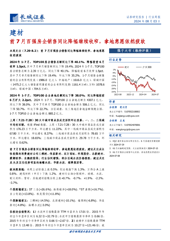 【长城证券】【20240803】建材行业周报:前7月百强房企销售同比降幅继续收窄,拿地意愿依然疲软-17页