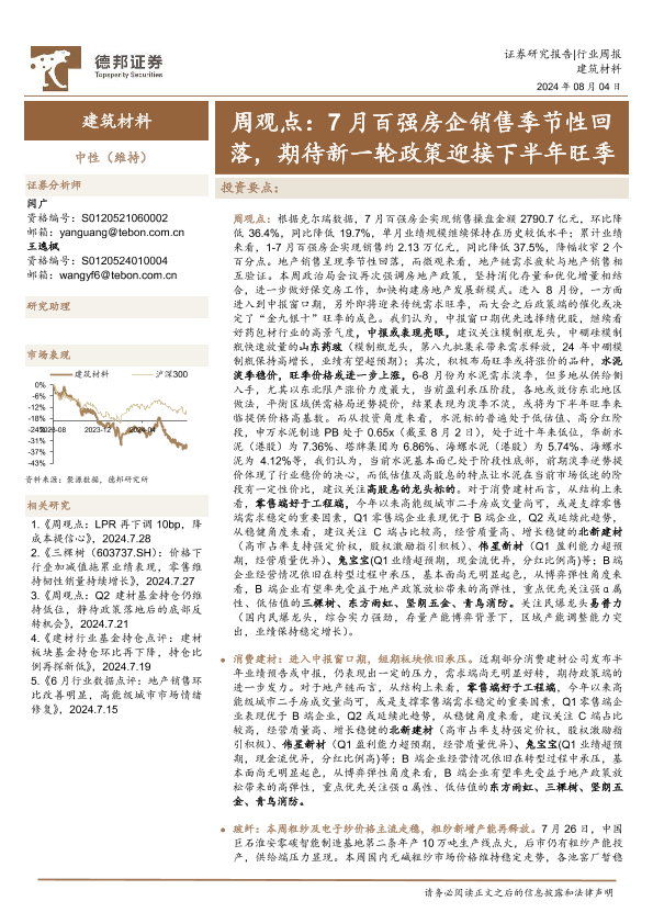 【德邦证券】【20240804】建筑材料行业周观点:7月百强房企销售季节性回落,期待新一轮政策迎接下半年旺季-31页