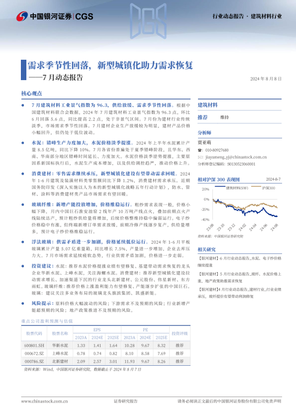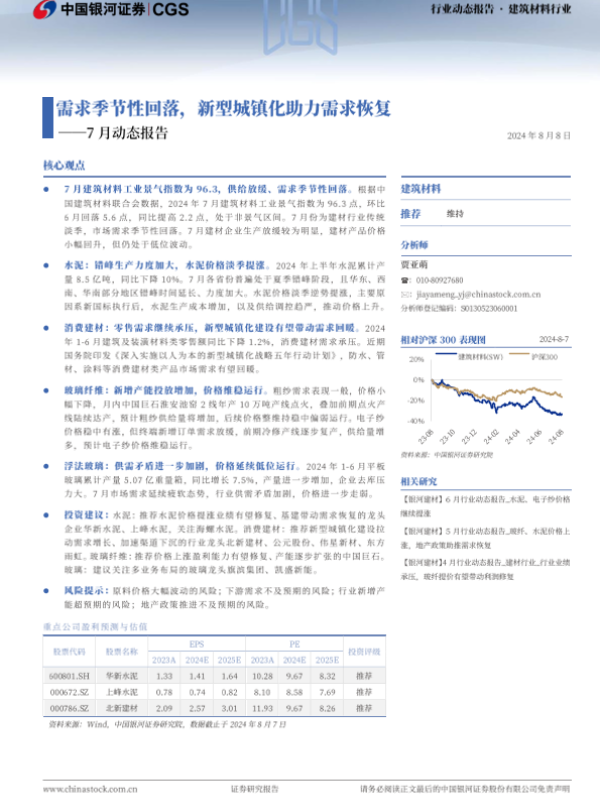 【银河证券】【20240808】建筑材料行业7月动态报告:需求季节性回落,新型城镇化助力需求恢复-22页