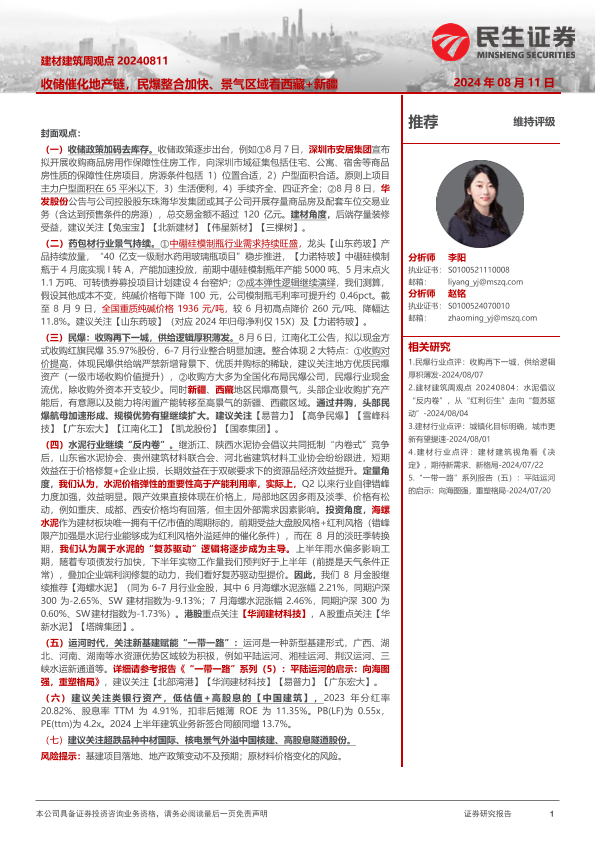 【民生证券】【20240811】建材建筑周观点:收储催化地产链,民爆整合加快、景气区域看西藏+新疆-22页