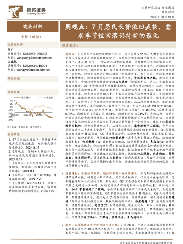 【德邦证券】【20240818】建筑材料行业周观点:7月居民长贷依旧疲软,需求季节性回落仍待新的催化-32页